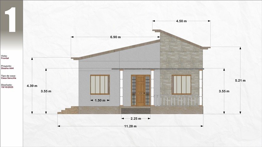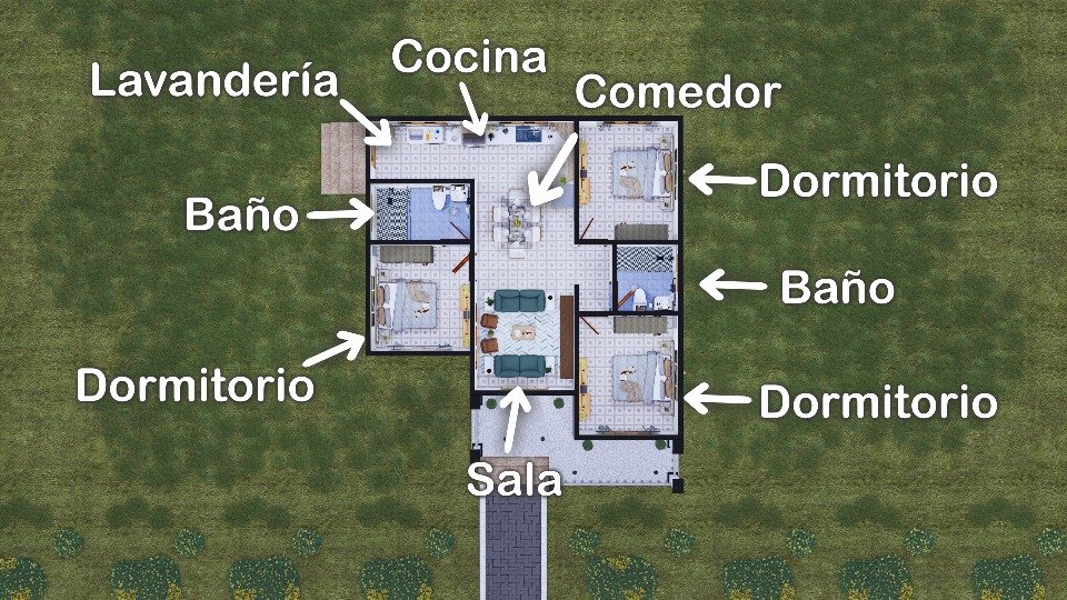 La distribución interior de esta vivienda es de diseño funcional y bien distribuido, maximizando el aprovechamiento del espacio que aporta confort y privacidad a sus moradores. Al dejar atrás la entrada principal, se llega a la sala, un lugar cálido que es el eje central de la casa y conecta totalmente con las restantes partes de la casa. A la derecha de la sala hay dos habitaciones secundarias, con un uso ideal para niños o las visitas, y un baño de uso compartido con acceso independiente que permite su uso sin invadir la intimidad de las habitaciones secundarias.