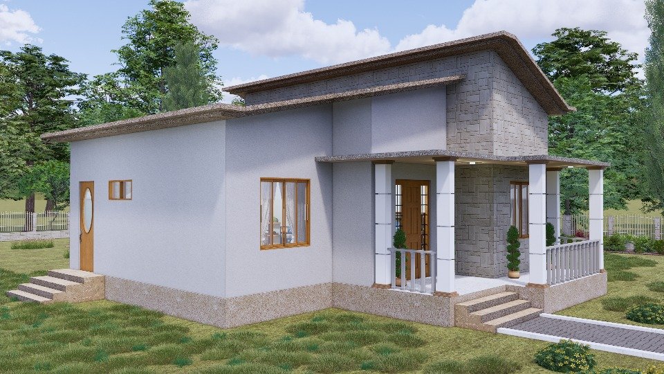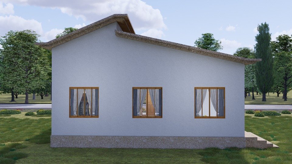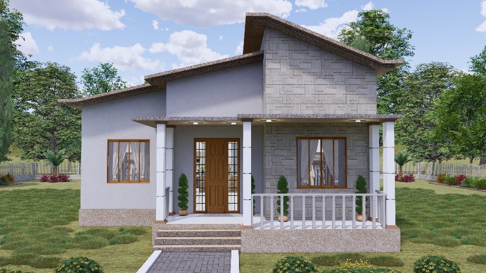 La fachada de esta vivienda combina sencillez con elegancia, presentando un diseño moderno con toques tradicionales que destacan la calidez de la vivienda. La estructura presenta líneas limpias y proporciones equilibradas, donde el uso del color gris claro de los muros contrasta armoniosamente con los marcos de las ventanas de madera natural, aportando un aire acogedor y hogareño.