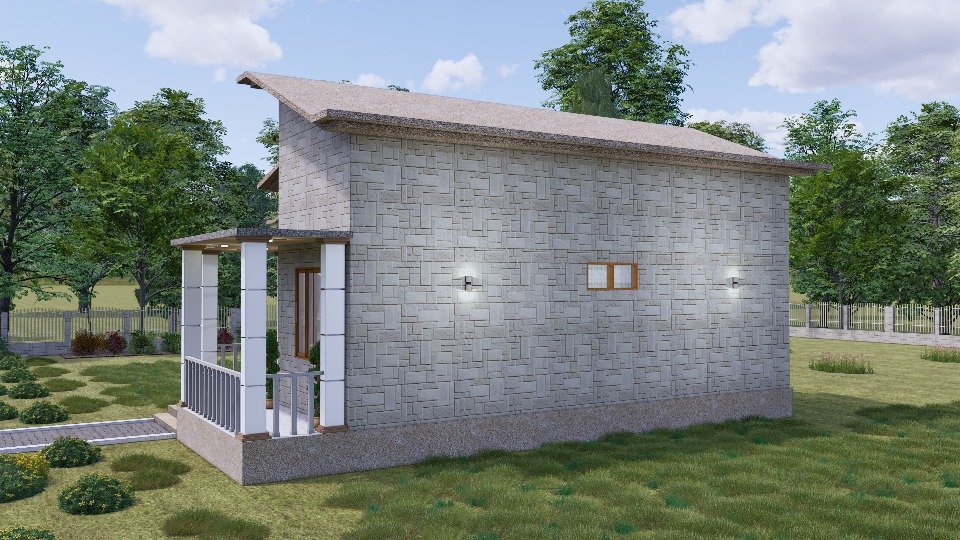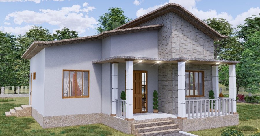 El detalle más llamativo y distintivo, sin embargo, es el volumen superior recubierto con piedra decorativa, que no solo aporta textura y profundidad visual, sino que, además, corta la monotonía de las superficies lisas, ofreciendo un carácter contemporáneo a la vivienda. El tejado a dos aguas con aleros pronunciados refuerza, por su parte, la sensación de protección y de amplitud, mientras que el escalón frontal contribuye a garantizar un acceso altamente cuidadoso y funcional.