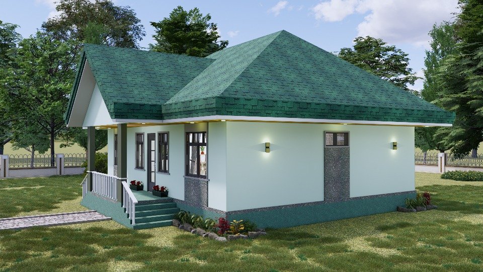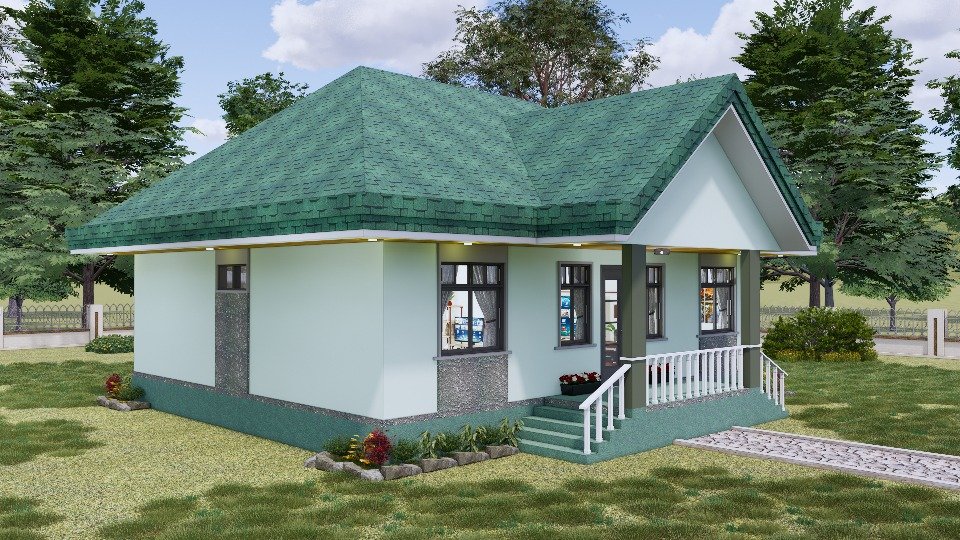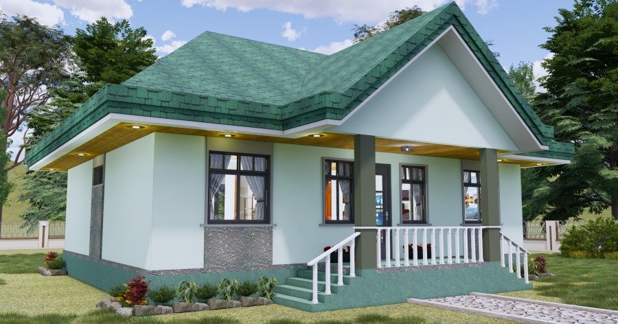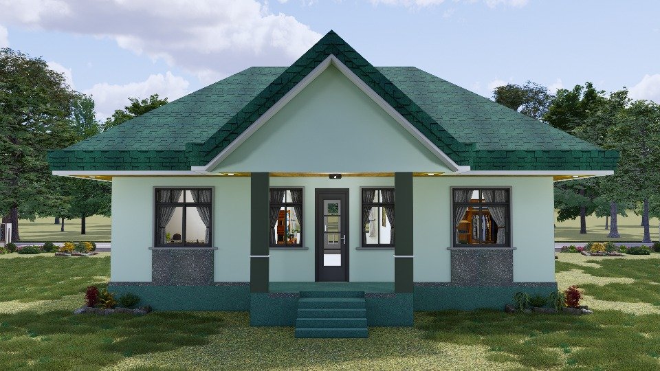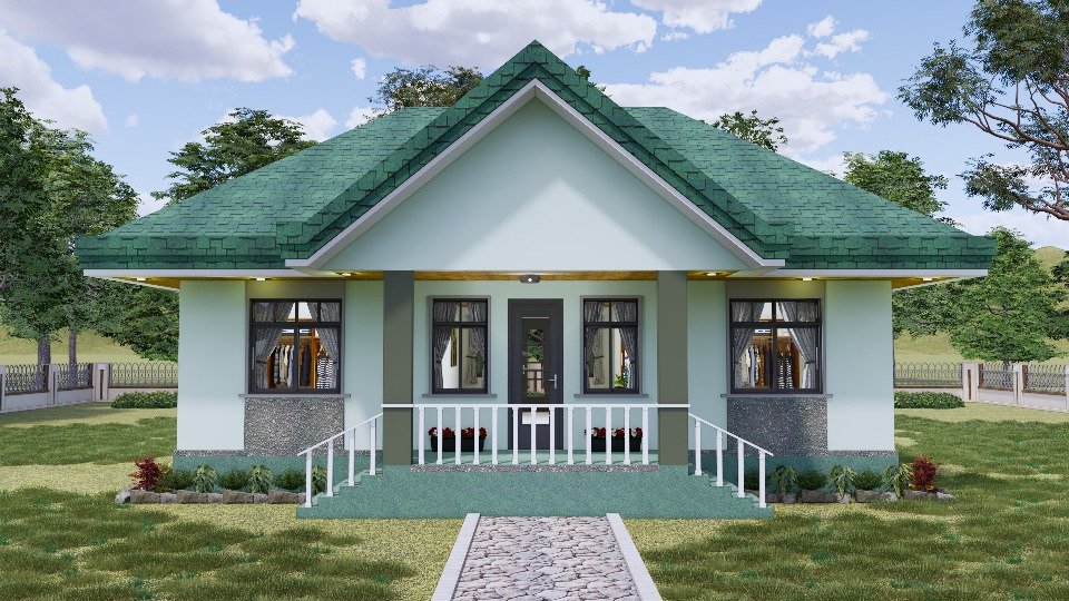 La apariencia de la fachada de esta casa tiene un estilo muy actual, combinado con un aspecto acogedor, logrando transmitir la idea de hogar incluso desde el primer sencillo vistazo. Su diseño de una sola planta se basa en las paredes pintadas en un tono verde claro que combinan extraordinariamente con un tejado de tejas verdes de un tono muy oscuro.