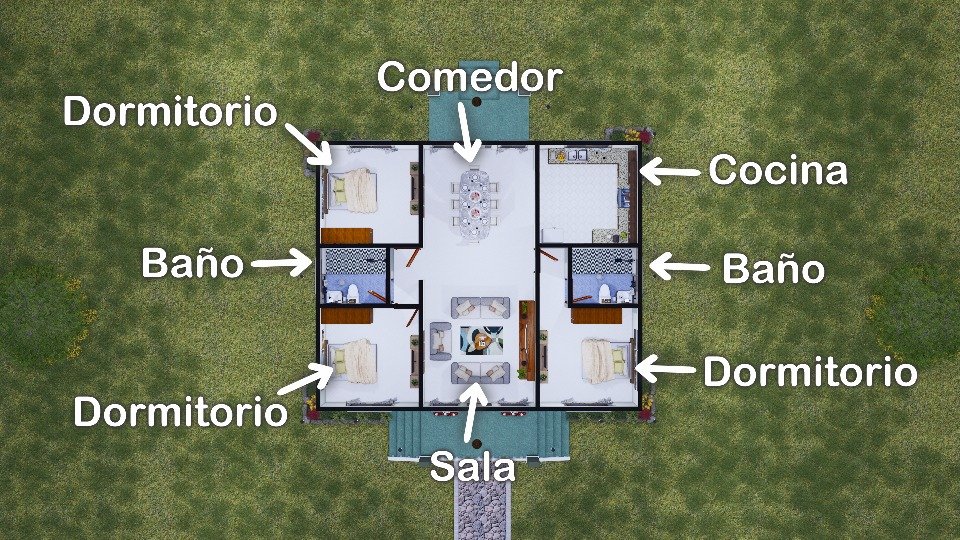 Al lado izquierdo de la casa encontramos, por un lado, dos dormitorios más, perfectos para hijos o visitas, y por el otro, un baño común, con acceso independiente desde el pasillo/área de circulación, lo que favorece la funcionalidad del hogar cotidiano, ya que tanto residentes como visitantes pueden tener acceso a un baño sin entrar en las habitaciones. El conjunto de la vivienda muestra un plano pequeño, bien utilizado y armónico, con espacios que tienen sentido y se enganchan con el resto de la casa.
